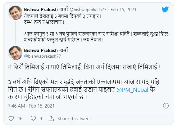 त्यस्तै उनले गायिका अञ्जु पन्तले गाएको गीत पनि सम्झिँए ‘न बिर्सें तिमिलाई न पाएं तिमिलाई, बिना अर्थ दिलमा सजाएँ तिमिलाई ! तीन नर्ष अघि दिएको मत सम्झँदै जनताको एकालापमा आज सायद यहि गीत छ ! रंगिन सपनाहरुको हवाई उडान पाइलट @PM_Nepal कै कारण चुंडिएको चंगा जो भएको छ !’